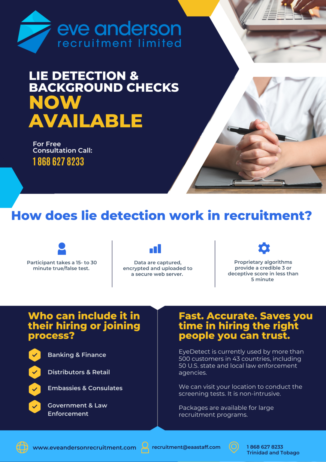 Eve Anderson Recruitment launches a new complimentary recruitment service to their portfolio. It’s a next-generation lie detector software that measures slight changes in eye behaviors to detect lies and is a growing request in the recruitment process for many companies globally.